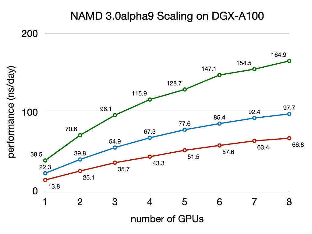 In sequencing we can increase the number of CPUs we throw at a problem, and generally expect linear increase in speed. That’s not always the case in other in other disciplines. Take molecular dynamics simulations for example. Every timestep all cores need to receive updates from all other cores. This increased communication load, means that scaling falls off with core count: